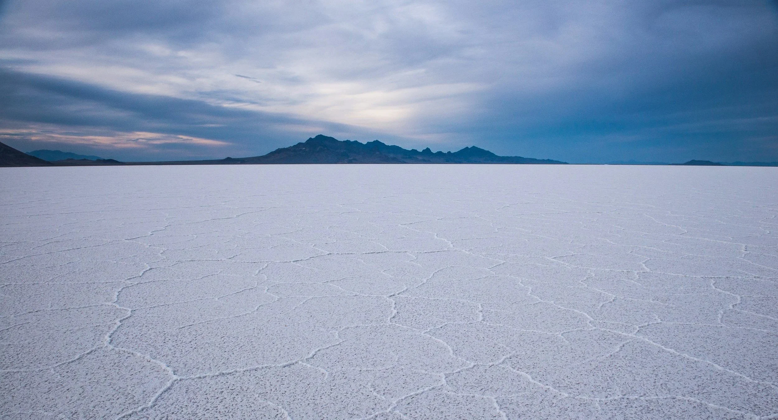 Salt flats with a mountain range in the distance and a cloudy sky